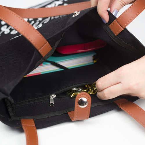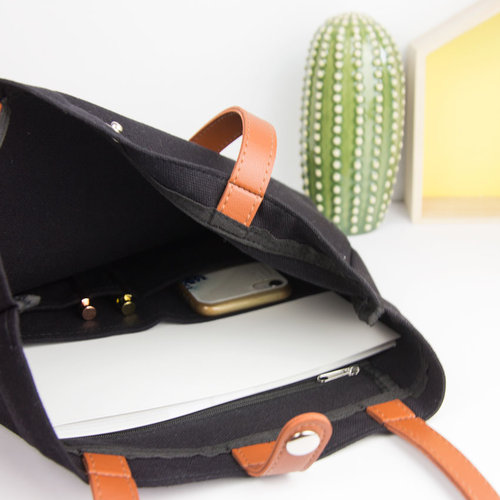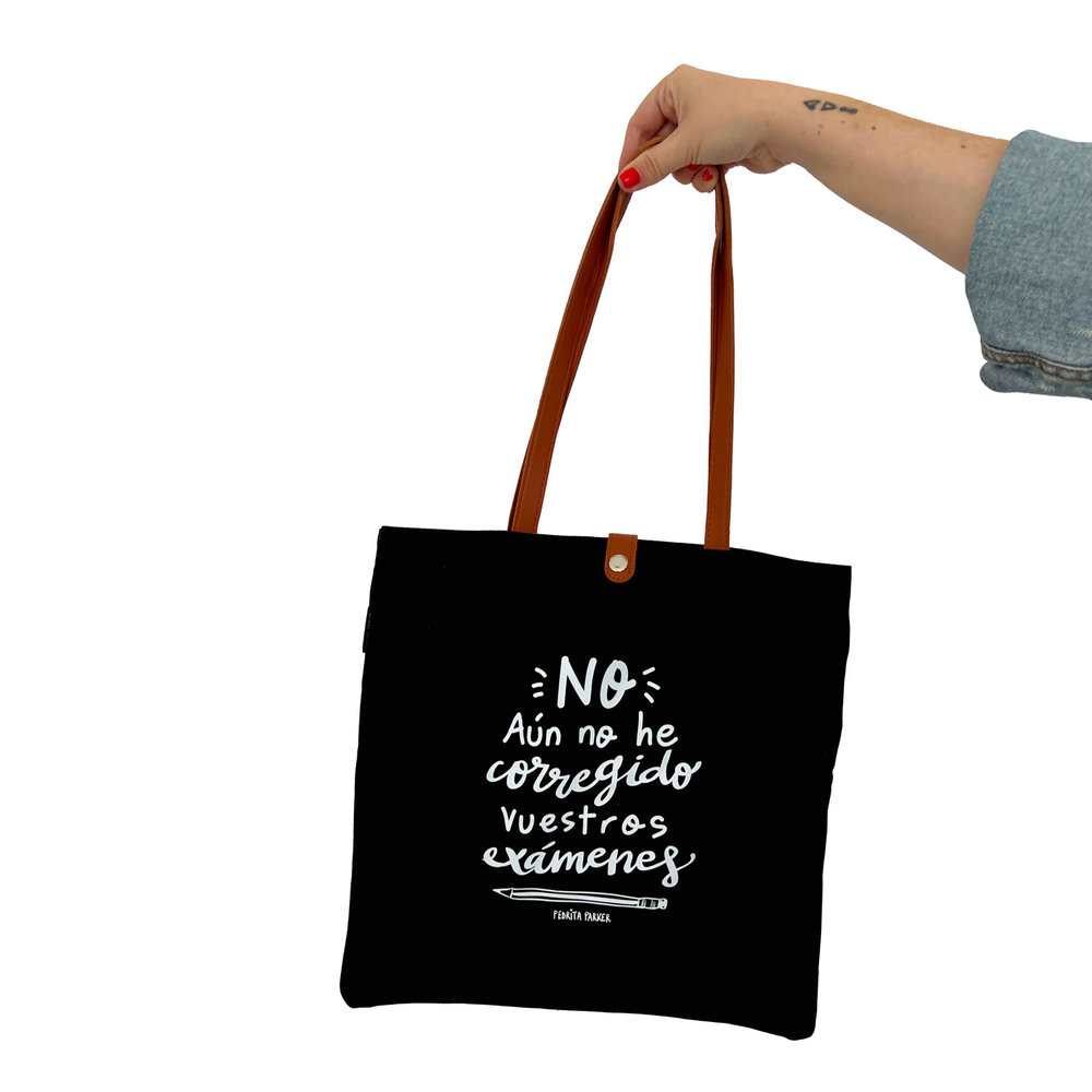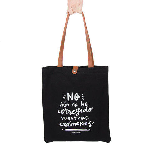 Bolso de lona negra con asas de polipiel y con la frase ilustrada «No, aún no he corregido vuestros exámenes» de Pedrita Parker.